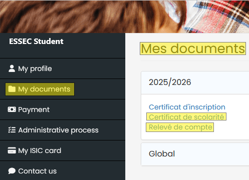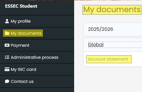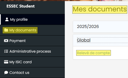 Students can download the ESSEC account statement, available in "My Documents", either for the duration of the basic package of their course (which does not include repeat years nor additional years) or for the current school year, see screenshots below. For security reasons and to avoid identity theft, the Office of the Registrar will let you access your own document using the secured MyRegistrar platform, rather than sending it to any requester by email.